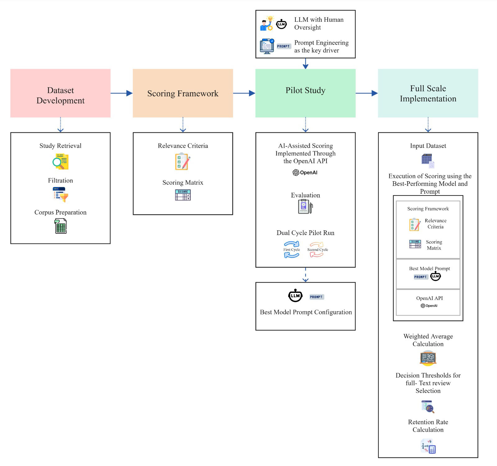 Energy poverty remains a persistent challenge faced by LMICs of the world where access to modern energy systems is limited. The advancement of AI is seen as a potential tool to improve the energy planning and management in LMICs. Despite this, the extent to which AI has been integrated in LMICs energy systems remains unclear, especially where data management practices and ethical considerations are also accounted for. The literature available that addresses these issues remains highly fragmented and dispersed which calls for a scoping review to map the breadth of the research. But conducting scoping review proposes its own set of challenges since it relies heavily on labour intensive manual screening and requires substantial time and effort. This thesis attempts to address both of interconnected challenges by developing an AI[1]assisted scoring framework to help screening and dealing with large volume of studies and thematic analysis of the resulting evidence base. An AI–human collaborative approach was developed where an initial corpus of 615 studies, 123 abstracts were first assessed by human reviewers and six GPT models combines with 3 prompt levels to benchmark relevance scores on three relevance criteria, AI integration, Data Management and Ethical considerations. A dual phase pilot study was conducted with the o3-mini model paired with Level 2 prompt achieving the highest alignment with human judgments (95%) was identified. This configuration was applied to the full dataset, yielding 80 candidate studies based on primary thresholds and override conditions, of which 64 studies were retained after human verification. A reflexive thematic analysis using the six-phase design process of the final 64 studies identified four key themes, indicating that AI deployment in LMIC energy systems remains largely research-centric, supported by adaptive but fragile data practices, and rarely guided by formal ethical frameworks. Overall, the findings suggest that AI[1]assisted screening, when combined with human oversight, may help scale scoping reviews in under-researched domains, while also highlighting important gaps in the responsible integration of AI within LMIC energy systems.