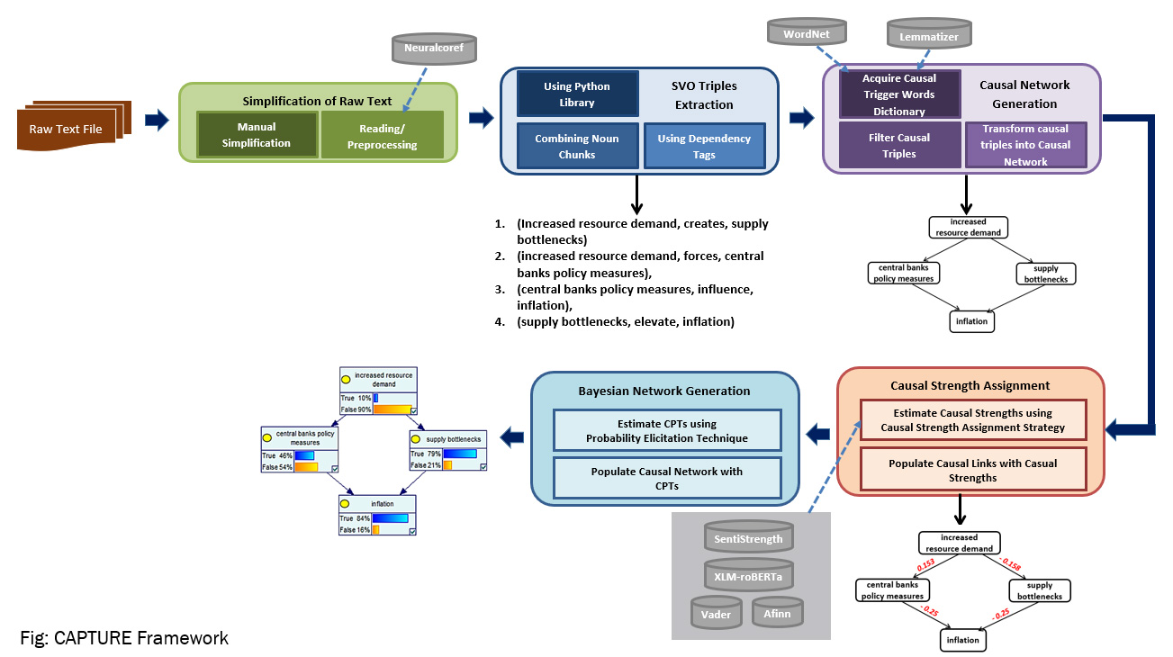 This dissertation addresses the problem of constructing Bayesian Networks (BNs) from raw text. Traditionally, domain experts identify and encode causal relationships based on their knowledge and interpretation of any relevant narrative while constructing a BN. Although effective in capturing expert insight, this method is inherently time-consuming, resource-intensive, and difficult to scale. If quantitative data about relevant variables in a BN is available, then the BN construction process can be automated via structure learning techniques. These techniques infer causal relationships from available datasets. However, the techniques require a substantial amount of data to construct the required probability distributions, rendering them inappropriate for data-scarce domains, where critical information remains embedded in unstructured text. The automated extraction of causality from raw text, on the other hand, presents its own set of challenges due to the linguistic complexity and ambiguity inherent in the texts. Furthermore, many existing systems in this field tend to be domain-specific, thereby lacking generalizability. These challenges imply the need for a generalized and semi-automated human-in-loop approach that is suitable for data-scarce domains. This research, therefore, focuses on developing a generalized and semi-automated framework, named CAPTURE (CAusal and Probabilistic graphical model exTraction from Unstructured Raw tExt), for constructing Bayesian Networks from raw text, with a particular emphasis on data-scarce domains. The devised framework is implemented using two components: SCANER (Semi-automated CAusal Network Extraction from Raw text) and LEAPE (Lexicon and Embedding-based Automated Probability Estimation). In the first phase, SCANER extracts causal networks from the raw text through manual simplification and a set of natural language processing rules. In the second phase, LEAPE transforms these causal networks into Bayesian Networks by automatically estimating and assigning probabilities. This novel approach for estimating probability distributions utilizes lexicon and embedding-based sentiment detection instead of frequency-based methods, thereby making it suitable for data-scarce domains. The performance of CAPTURE is assessed by using raw text from the Political, Water Management (Industrial Control System), Medical, and Food Insecurity domains. F1-score is used to evaluate the causal networks generated in the first phase. For this purpose, the ground truth for the causal links is generated after incorporating feedback from a group of three human evaluators. The BNs generated in the second phase are evaluated using the mean Kullback–Leibler Divergence (KLD). A comparative analysis with a readily available causality extraction system demonstrates the advantages of the presented framework in generating dense and accurate causal networks from the raw text. Furthermore, a comparative analysis with modern-day LLMs, including ChatGPT, Mistral Chat, and Gemini, also highlights the potential advantages of combining them with rule-based methods for improved results. Overall, the results demonstrate the framework’s effectiveness in accurately eliciting foundational CPTs across diverse datasets.